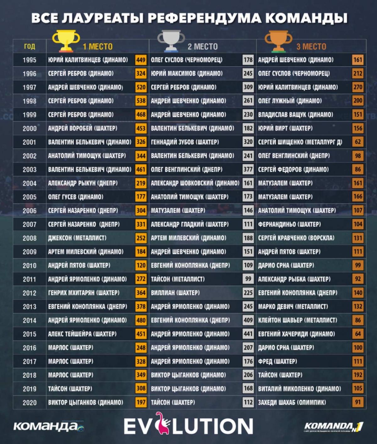 На победу в референдуме "Команды1" претендуют три футболиста Динамо и один игрок Днепра-1.