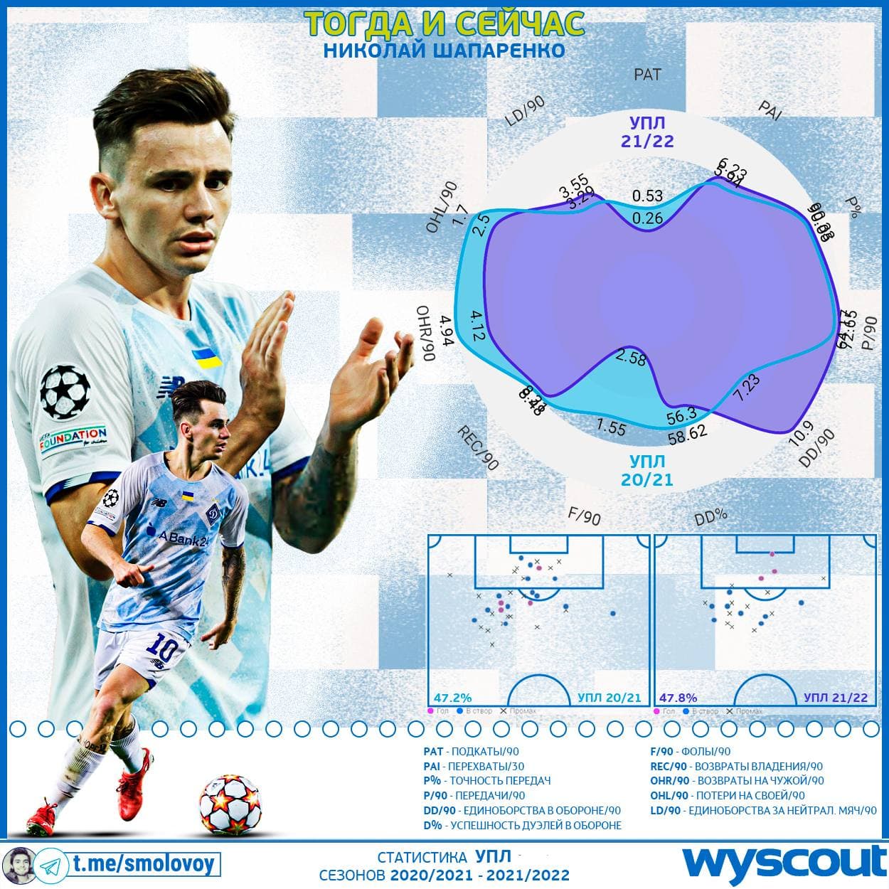 Точность при этом не упала (90.1% -> 90.3%), но нельзя упускать факт, что терять на своей половине Коля стал чаще (OHL/90). Оправдывать эту историю не стану: давление против Динамо в УПЛ упало с 14.21 PPDAa до 16.2 PPDAa. Потому оставляю лишние 0.8/90 потерь на его совести. В этих 15-30-минутных отрезка полного «забивалова» на игру (Ингулец, Мариуполь, Минай и т.д.) он тоже участвовал.