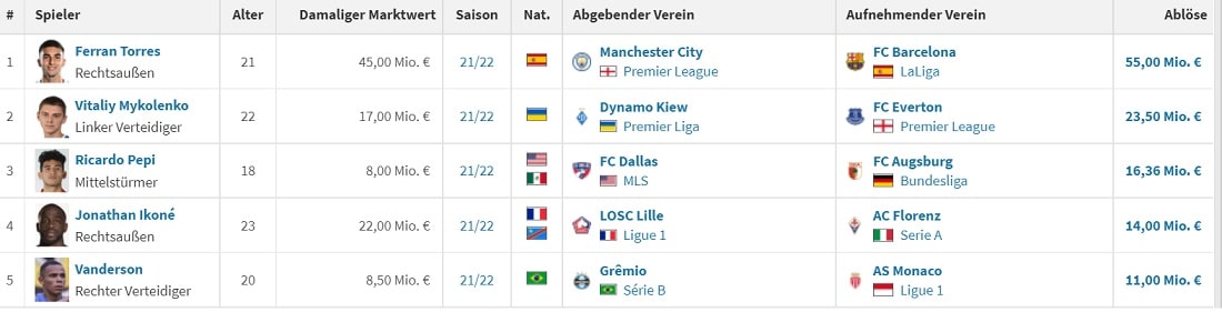 Выше расположился только трансфер испанского атакующего хавбека Феррана Торреса из Манчестер Сити в Барселону (55 млн евро), полагает авторитетный немецкий портал transfermarkt.de.