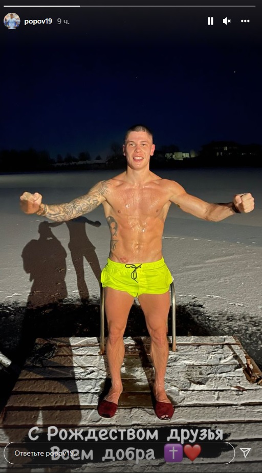 Защитник «Динамо» Денис Попов, который сейчас восстанавливается после тяжелой травмы, искупался на Рождество в проруби.