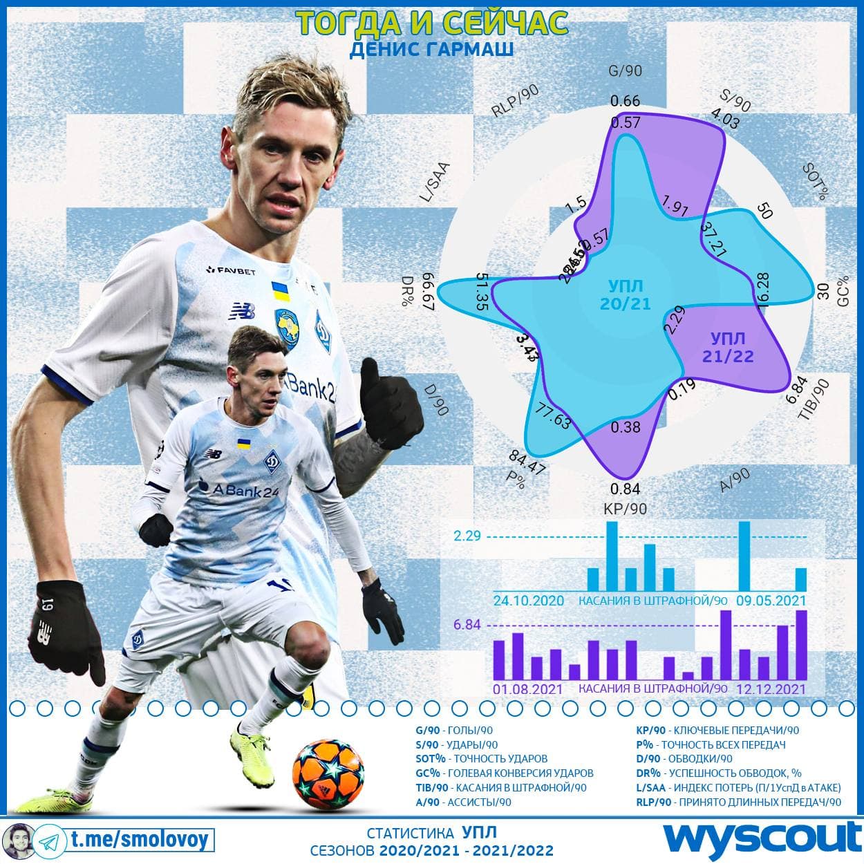 Сегодня (среди живых) в УПЛ Гармаш не выглядит намного слабее звёздного Довбыка, даже превосходя форварда сборной в ряде аспектов (борьба, например). Наверное, это беда для всей Лиги. Но чувствуется, что Денис не профильный нападающий.