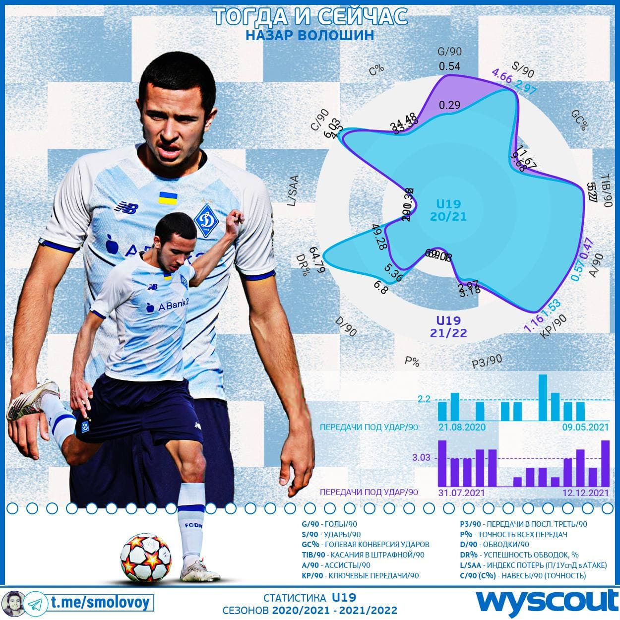 Назара ещё в 17-летнем возрасте начали активно использовать в U19 и у Мороза (2020/2021). Сезон получился феноменальным с 16 (!) ассистами. А качество средней передачи под удар было топовым: