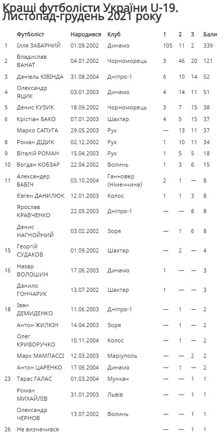 Неплохой результат показал Владислав Ванат, которого упомянули в 51,9% анкет (69 из 133). В квартет лучших вошли Даниэль Кивинда и Александр Яцык, которые показали очень результативную игру в ноябре и декабре за команды U-19: Кивинда — 6 голов, Яцык — 5. Причем первый — форвард, а второй — центральный полузащитник.