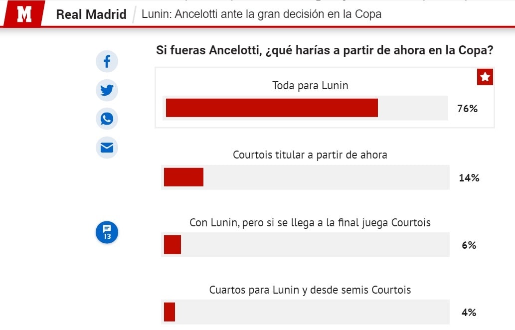 Популярная испанская газета Marca попыталась выяснить у своих читателей, как бы они поступили на месте главного тренера Сливочных с первым номером команды в решающих матчах кубка страны.