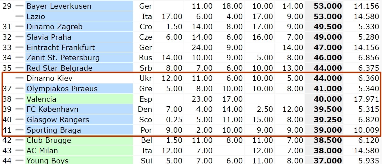 Среди упомянутых клубов "Зальцбург" и "Вильярреал" будут играть в феврале в 1/8-й финала Лиги чемпионов (могут набрать очки как в рейтинг клубов, так и в Таблицу коэффициентов), а "Олимпиакос", "Рейнджерс" и "Брага" – в 1/16-й (стыковой раунд) Лиги Европы и Лиги конференций (могут набрать очки только в Таблицу коэффициентов). "Лион" и "Копенгаген" квалифицировались сразу в 1/8-ю финал Лиги Европы и Лиги конференций соответственно.