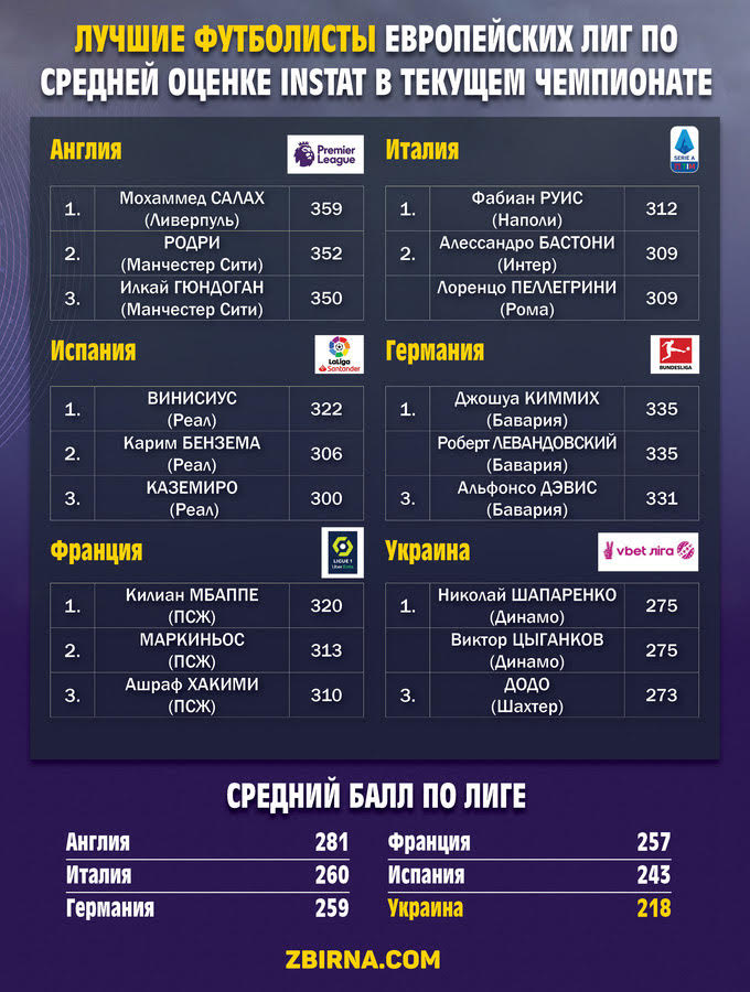 В этот уик-энд возобновляются ведущие европейские чемпионаты, и zbirna.com решилf отметить футболистов, которые на данный момент являются самыми полезными в своих лигах. За основу взяли рейтинг эффективности компании InStat. Так, самая высокая средняя оценка на данный момент у нападающего Ливерпуля Мохамеда Салаха, и она в 1,3 раза выше, чем у лучшего игрока УПЛ, полузащитника Динамо Николая Шапаренко. Впрочем, и сам английский чемпионат, понятное дело, котируется намного выше.