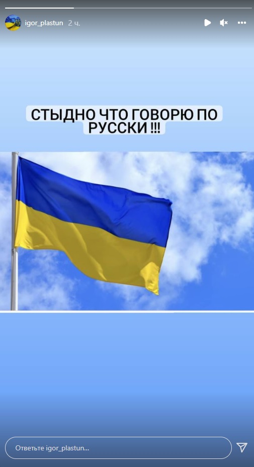 - Стыдно, что говорю по-русски! - написал Пластун в Инстаграме, прикрепив фото с украинским флагом.