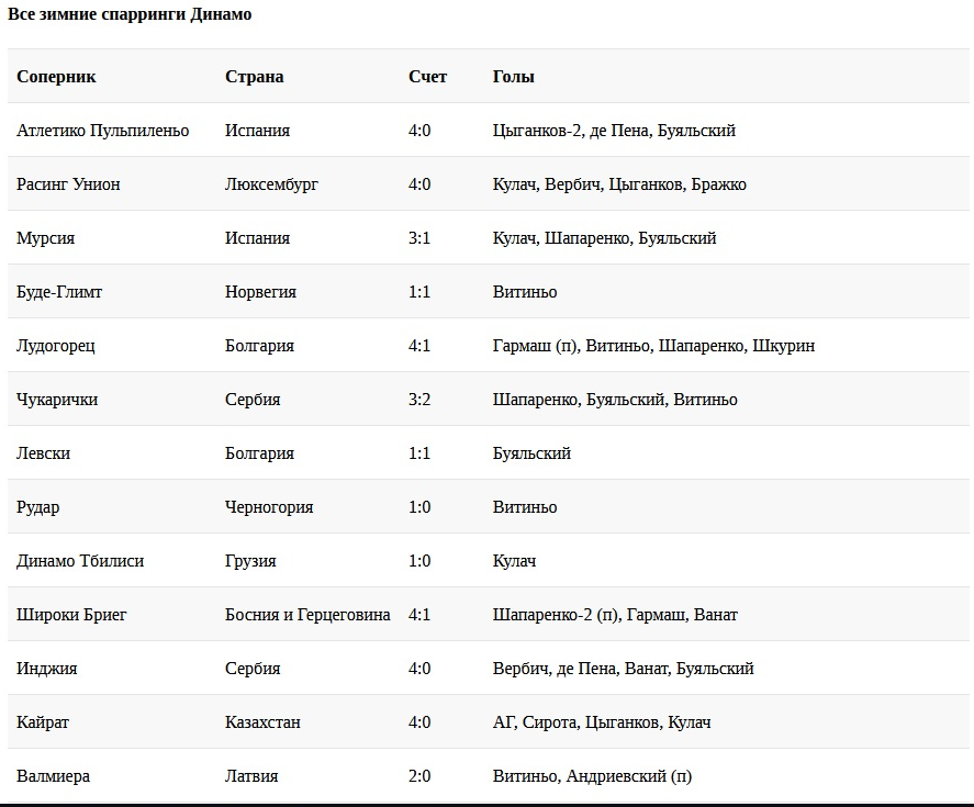 По ходу сборов динамовцы выдали серию из семи викторий, а также четыре «сухих» поединка кряду. В активе украинской команды четыре крупные победы и три волевые. В матче с Чукаричками (3:2) подопечные Луческу умудрились выиграть со счета 0:2. Забивали бело-синие в 14-ти спаррингах, а сохраняли свои ворота «на замке» в восьми.