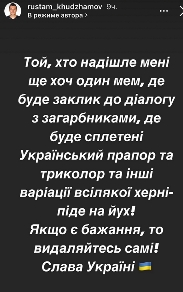 "Тот, кто пришлет мне хоть один мем, где будет призыв к диалогу с захватчиками, где будет сплетен украинский флаг и триколор и другие вариации всякой херни – пойдет на йух! Если есть желание, то удаляйтесь сами! Слава Украине", - написал Худжамов в Instagram.