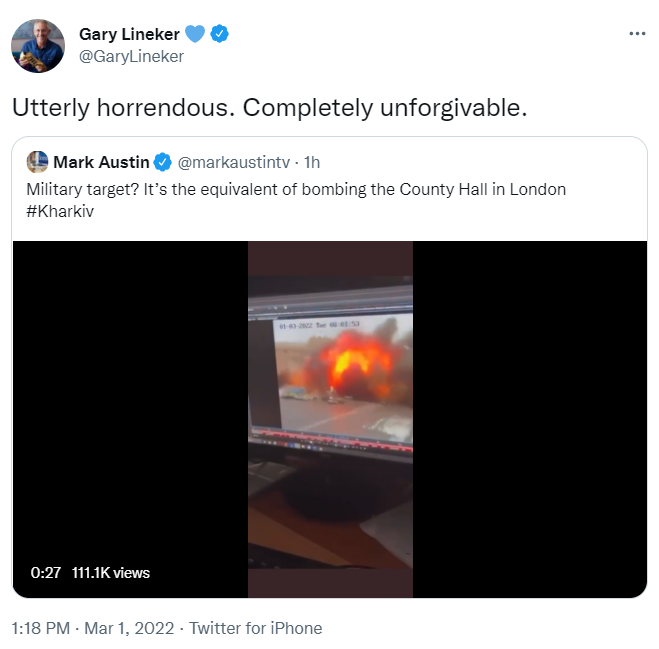 Бывший нападающий сборной Англии Гари Линекер отреагировал на ужасные методы войны российского агрессора против Украины.