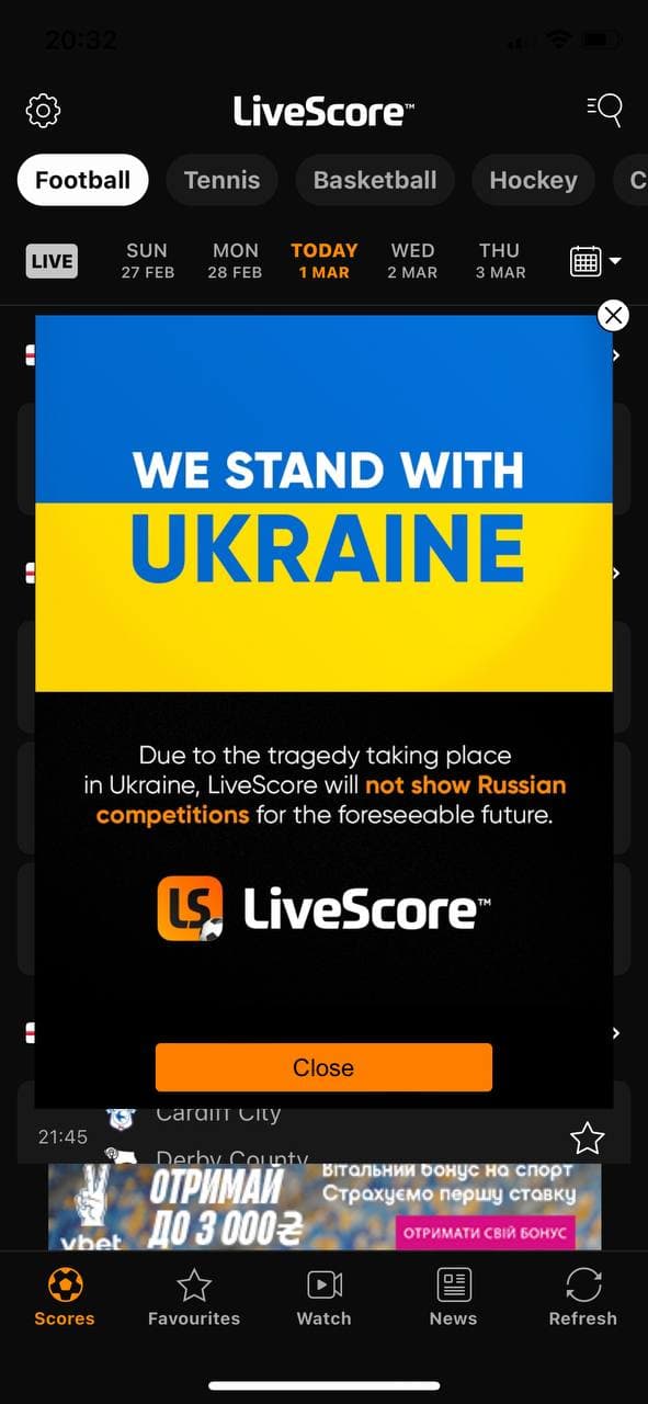 "В знак солидарности с народом Украины". LiveScore перестал освещать все российские соревнования