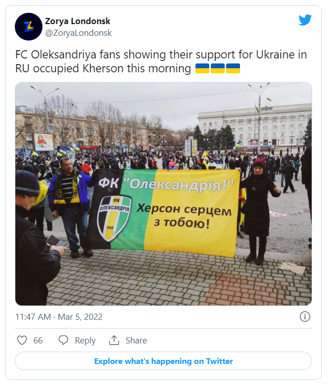 Сегодня тысячи херсонцев с сине-желтыми флагами вышли на митинг против оккупации. По сообщениям очевидцев, им даже удалось голыми руками прогнать российскую армию из центра города. Приняли участие в этом и фанаты Александрии. Соответствующее фото появились в сети.