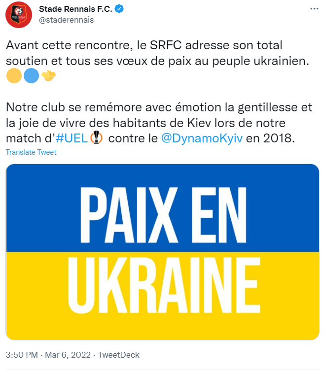 "Ренн" посылает свою полную поддержку и пожелания мира украинскому народу.