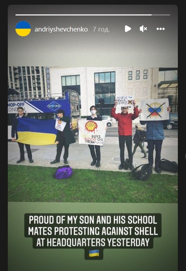 Даже сыновья Андрея Шевченко присоединились к борьбе. Один из них принял участие в митинге возле офиса компании "Shell", импортирующей нефть из России. "Горжусь своим сыном и его одноклассниками, которые протестовали у управления "Shell" вчера", – написал Шевченко на своей странице в Instagram.