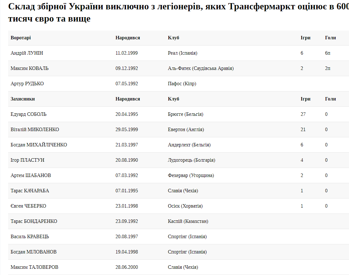 Но, если к списку «миллионеров» добавить тех, кого оценивают в 600-900 тысяч евро, мы получим еще 11 игроков. Среди них-еще два голкипера и правый защитник Богдан Милованов из испанского Спортинга.
