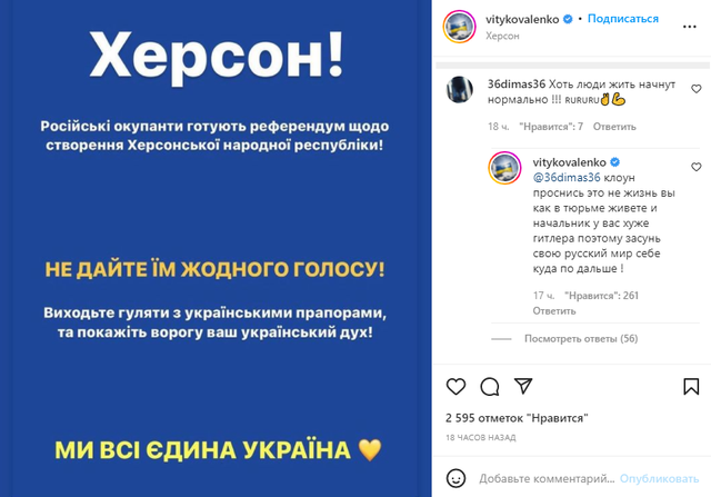 Поэтому засунь свой "русский мир" себе куда-нибудь подальше!" – написал Коваленко в комментариях к своему посту в Instagram, в котором призвал жителей Херсона не отдать ни одного голоса на так называемом референдуме за создание ХНР.