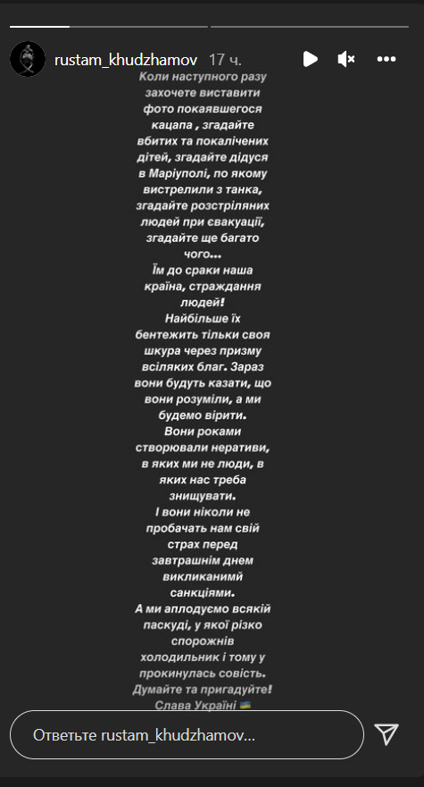 А мы аплодируем всякой паскуде, у которой резко опустел холодильник и потому проснулась совесть. Думайте и припоминайте. Слава Украине", - написал Худжамов на своей странице в Instagram.