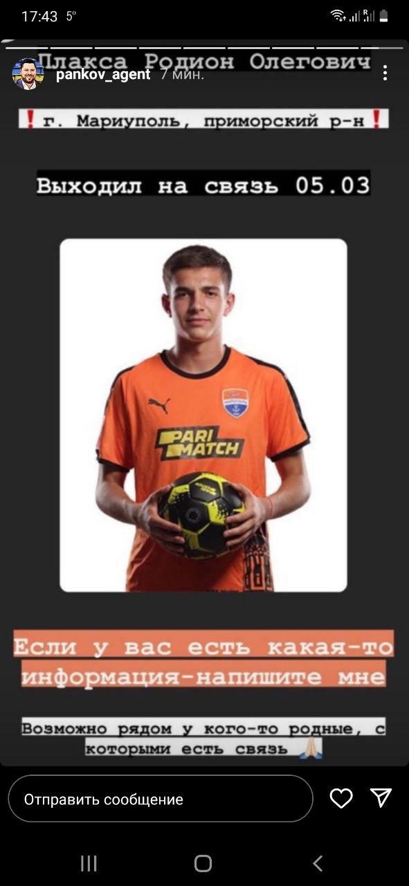 Футбольный менеджер Александра Панков в своем Instagram сообщил о пропаже 20-летнего игрока "Маруиполя" Родиона Плаксы.