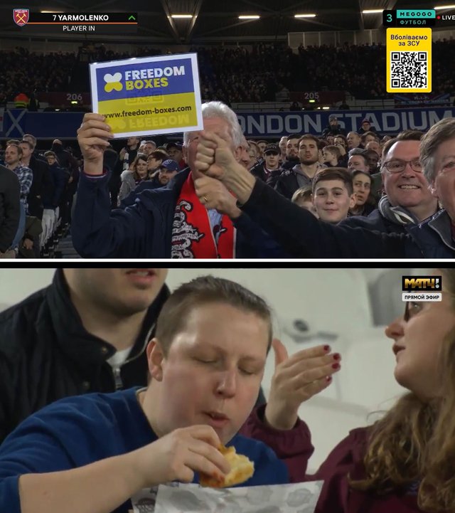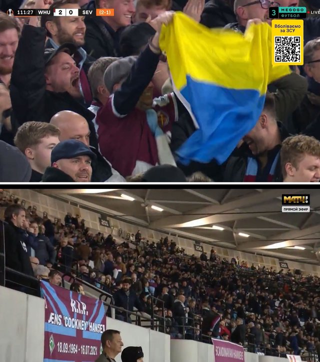 Российский телеканал, транслировавший матч против Севильи, делал все возможное, чтобы рабы Путина не увидели, как цивилизованный мир поддерживает Украину. Когда Андрей Ярмоленко выходил на поле и забил гол, монтажеры из-за "перебрика" вместо реальных кадров запустили архивные, где на трибунах не видно сине-желтой символики.