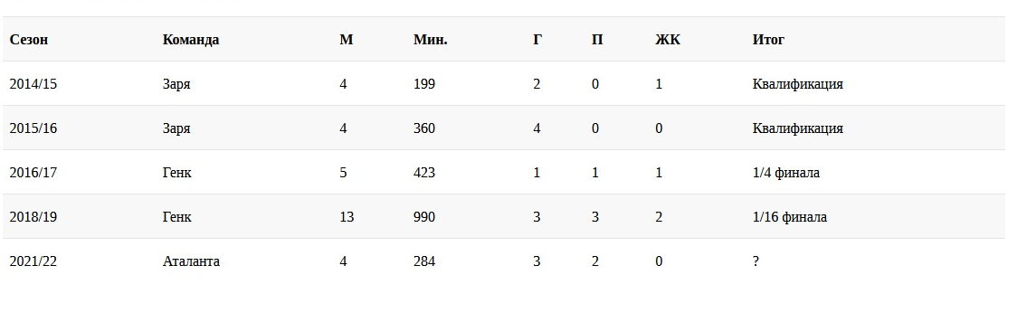 Для украинца это пятый в карьере розыгрыш Лиги Европы. По два пришлись на Зарю и Генк, а за время выступления в Аталанте он впервые попробовал себя в данном турнире.