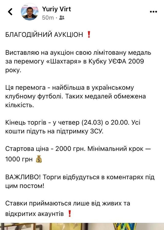 47-летний специалист выставляет на аукцион свою лимитированную медаль за победу Шахтера в Кубке УЕФА. Об этом он сообщил в Facebook.