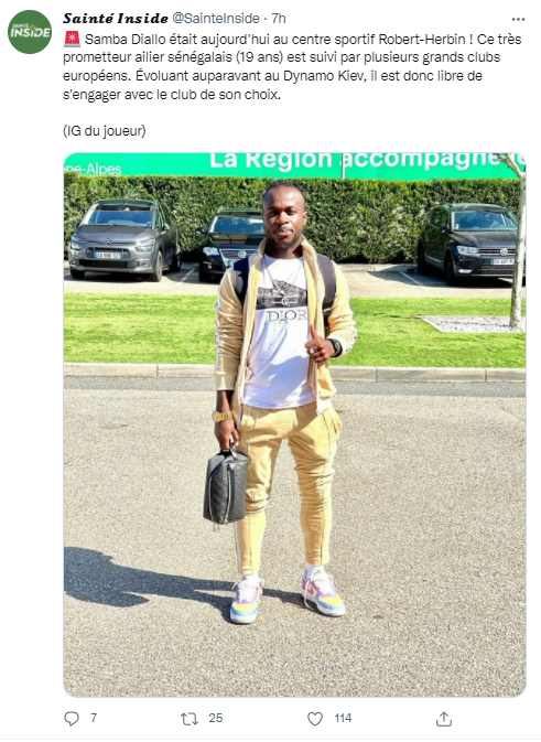 Полузащитник "Динамо" Самба Диалло был вчера в спортцентре Роберта-Гербина, где тренируется "Сент-Этьен". Об этом сообщает твиттер-аккаунт Sainte Inside.