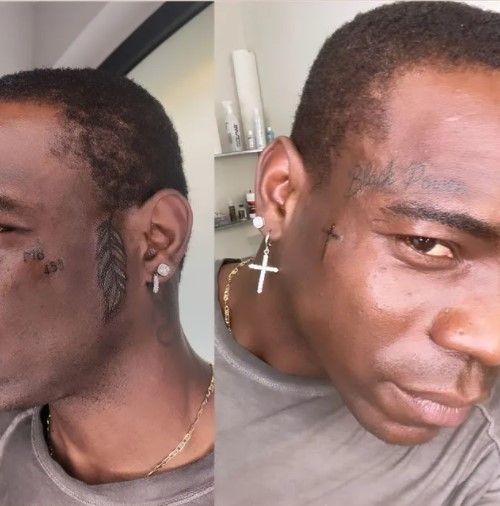 Бывший игрок «Интера», «Манчестер Сити» и «Ливерпуля» уже имеет ряд рисунков, украшающих различные части его тела. Над его глазом были набиты слова «Власть черных», а также крест на правой щеке и орлиное перо на другой стороне лица.