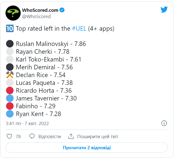 Самый высокий балл из ТОП-10 футболистов у полузащитника Атланты Руслан Малиновский. Общая оценка украинца – 7,86 балла.