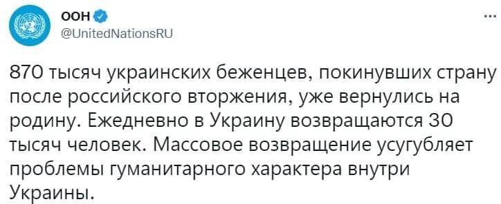 ООН: В Украину вернулись 870 тысяч беженцев, покинувших страну после вторжения российских оккупантов