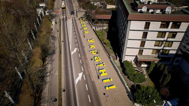 "Эта надпись - выражение осуждения войны, которое длится в Украине уже 50 дней. Вдобавок, тротуар напротив посольства превратили в уличную галерею "Свободная Украина", где можно видеть произведения, призывающие к прекращению российской агрессии, показывающие страдания жертв конфликта", - говорится в сообщении.