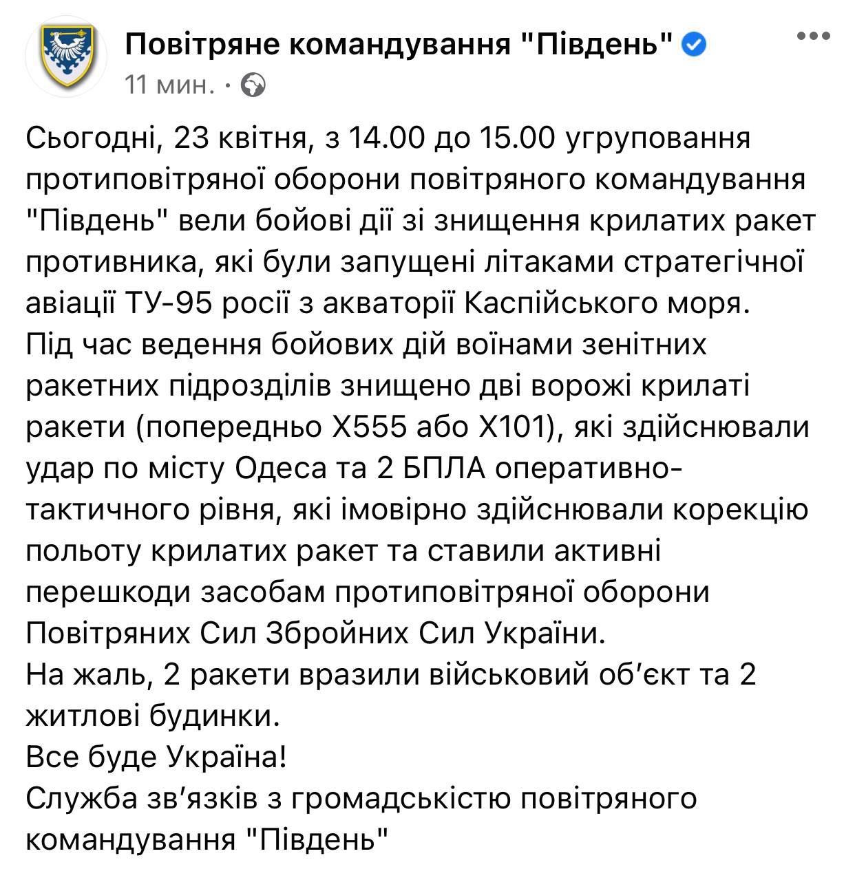 Воздушное командование «Юг»: Украинские военные уничтожили две российские крылатые ракеты, которые били по Одессе, и два дрона. Однако две ракеты поразили военный объект и два жилых дома.