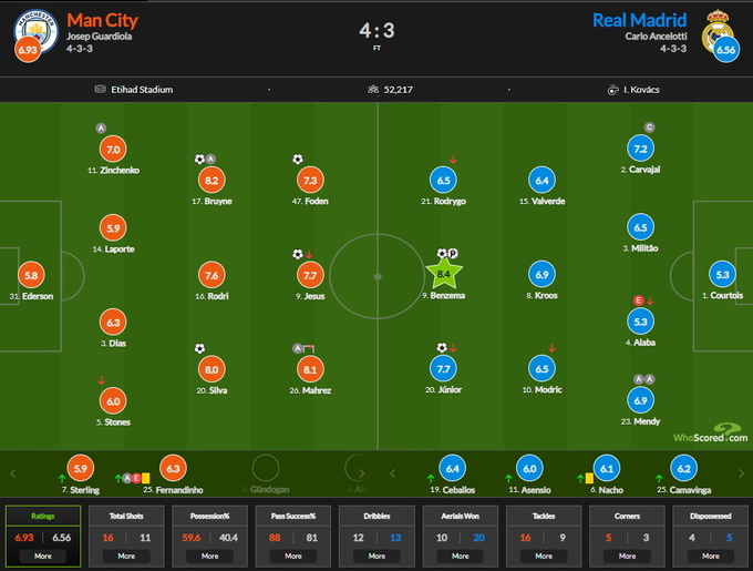 Зинченко получил от веб-портала WhoScored хорошую оценку 7.0. Лучшими у хозяев стали Кевин Де Брюйне (8.2), Рияд Марез (8.1) и Бернарду Силва (8.0). У мадридского клуба высоко оценен автор дубля Карим Бензема (8.4).