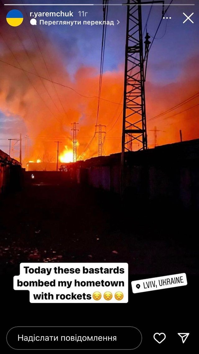 Украинский форвард Бенфики Роман Яремчук не сдерживал гнев после атаки на родной город. На своей странице в социальной сети Instagram нападающий опубликовал фото горящей подстанции и подписал его словами: "Сегодня эти ублюдки бомбили мой родной город ракетами".