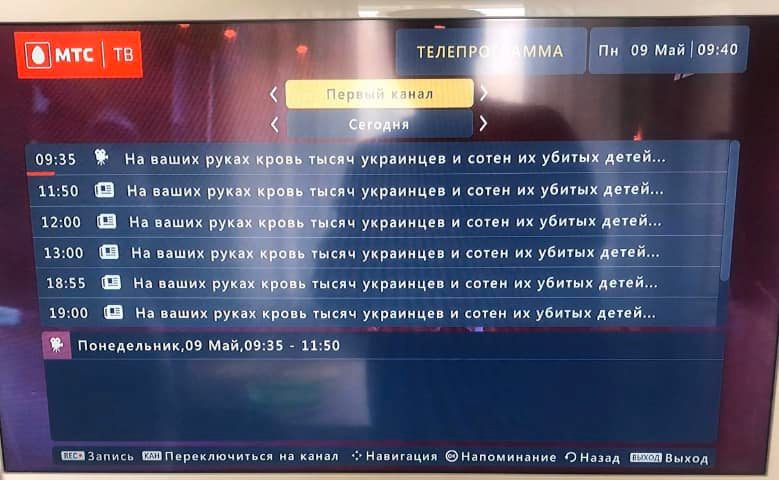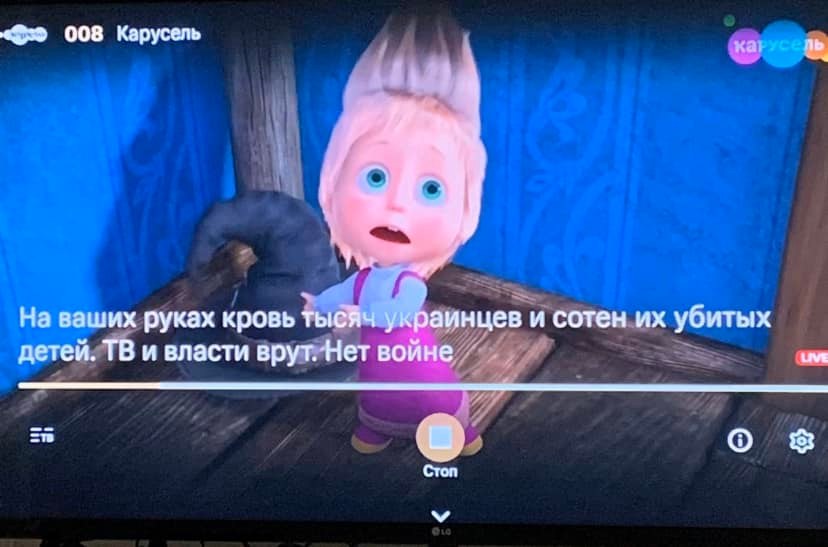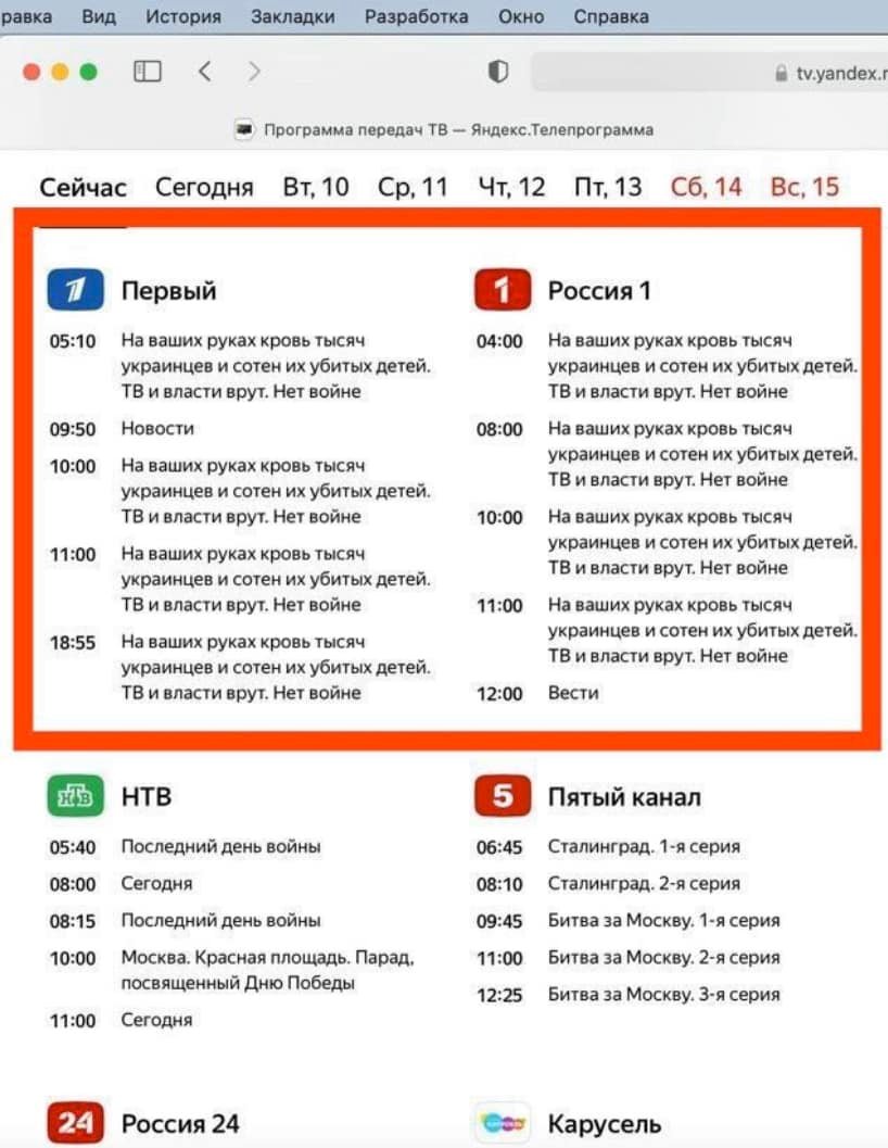 - Взломана программа на Яндексе . Сейчас первый и второй вовсе исчезли из расписания. Взломаны мтс , кион и другие . На экране стоит титр "на ваших руках кровь тысяч украинцев и сотен их детей. Тв и власти врут. Нет войне", - написала журналистка.