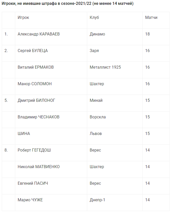 Среди всех футболистов, проведших в сезоне-2021/22 не менее двух третей матчей, только 21 на протяжении всей турнирной дистанции не заработали ни одной желтой карточки. Из этой своего рода отряда джентльменов наибольшее количество встреч отыграл защитник «Динамо» Александр Караваев - 18, который таким образом и удостоился звания самого дисциплинированного игрока чемпионата.