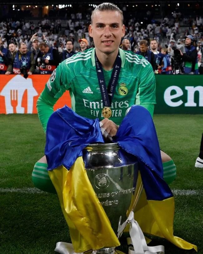 Голкипер "Реала" Андрей Лунин опубликовал фото с трофеем Лиги чемпионов и украинским флагом.