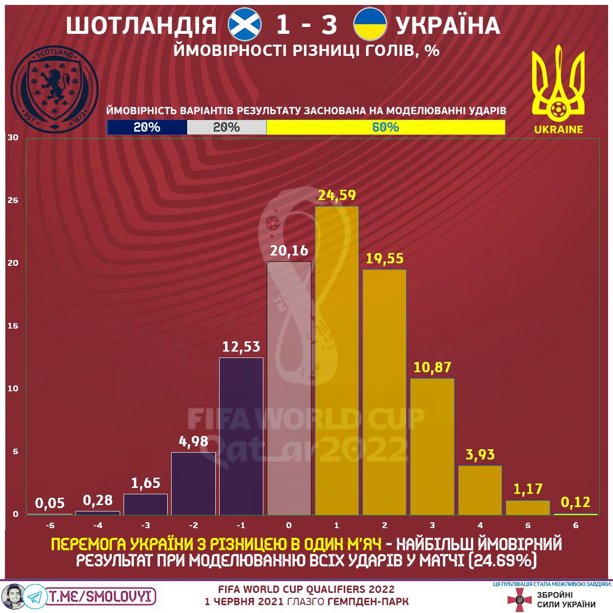 Якщо прогнати усі 27 ударів через симуляцію, то Україна здобула б перемогу у 60% випадків. Це багато. Ще по 20% на нічию та навіть перемогу хазяїв.