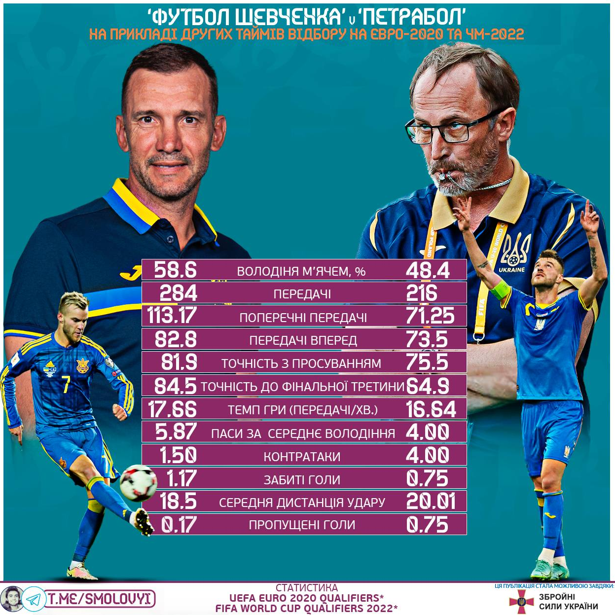 При Петракові збірна не грає в чистий «Петрабол» 100% ігрового часу, тому на рівні загальних метрик без поправок на суперника та обставини різниця загальна і не надто суттєва. Вона є, але не така разюча, як тут. Перепрошити Зінченка, Малиновського чи Ярмоленка грати в бий-біжи важко. Першим двом після Пепа і Гаспа складно перебудовуватись виключно на гру другом номером на контратаках. Вони не дурні, вони розуміють, що можуть знайти кращі шляхи ніж удар пиром в боротьбу. Ярмоленку у прямому сенсі важко здійснювати по 7-8 ривків за спини - він вже не у віці Мудрика, щоб займатися оздоровчою фізкультурою.