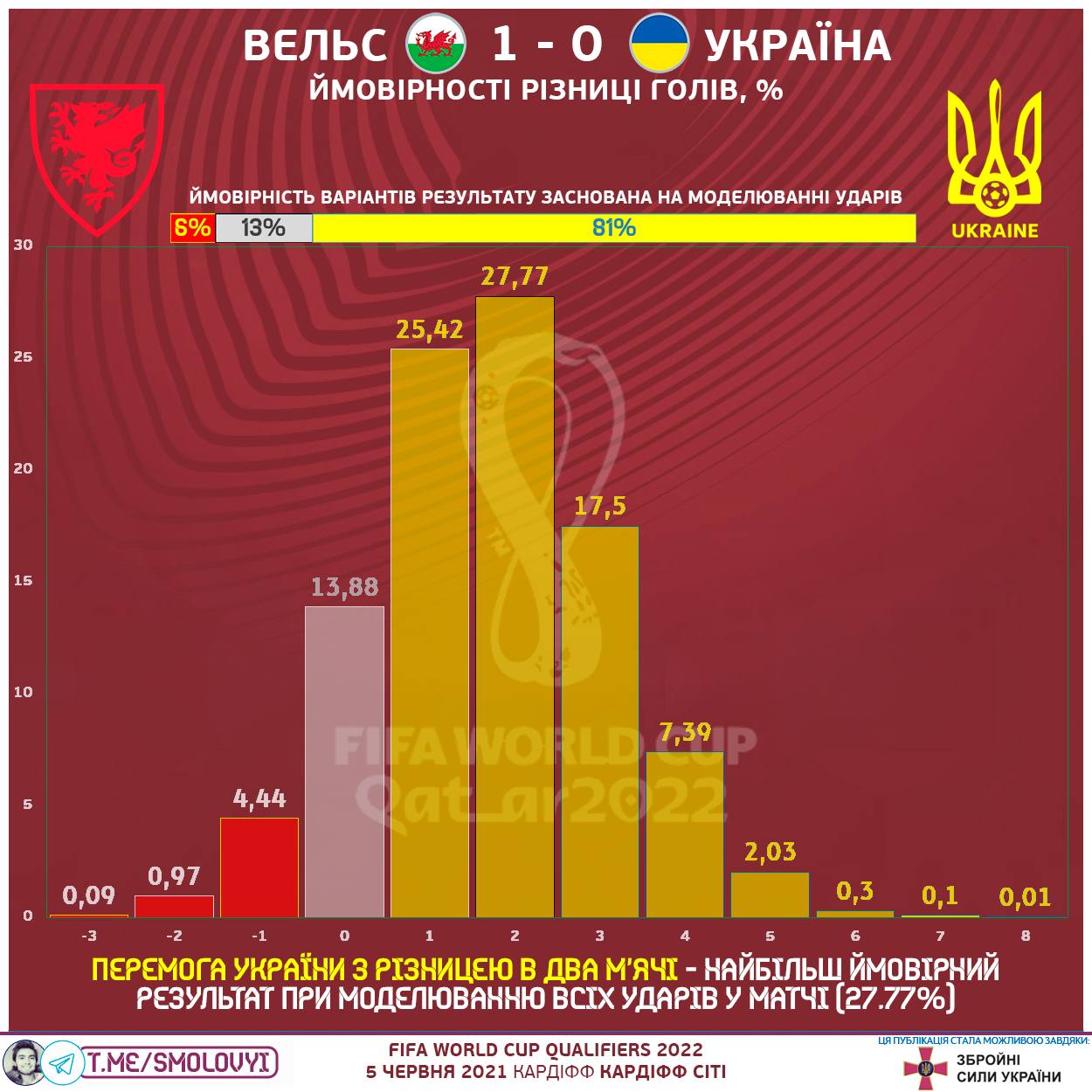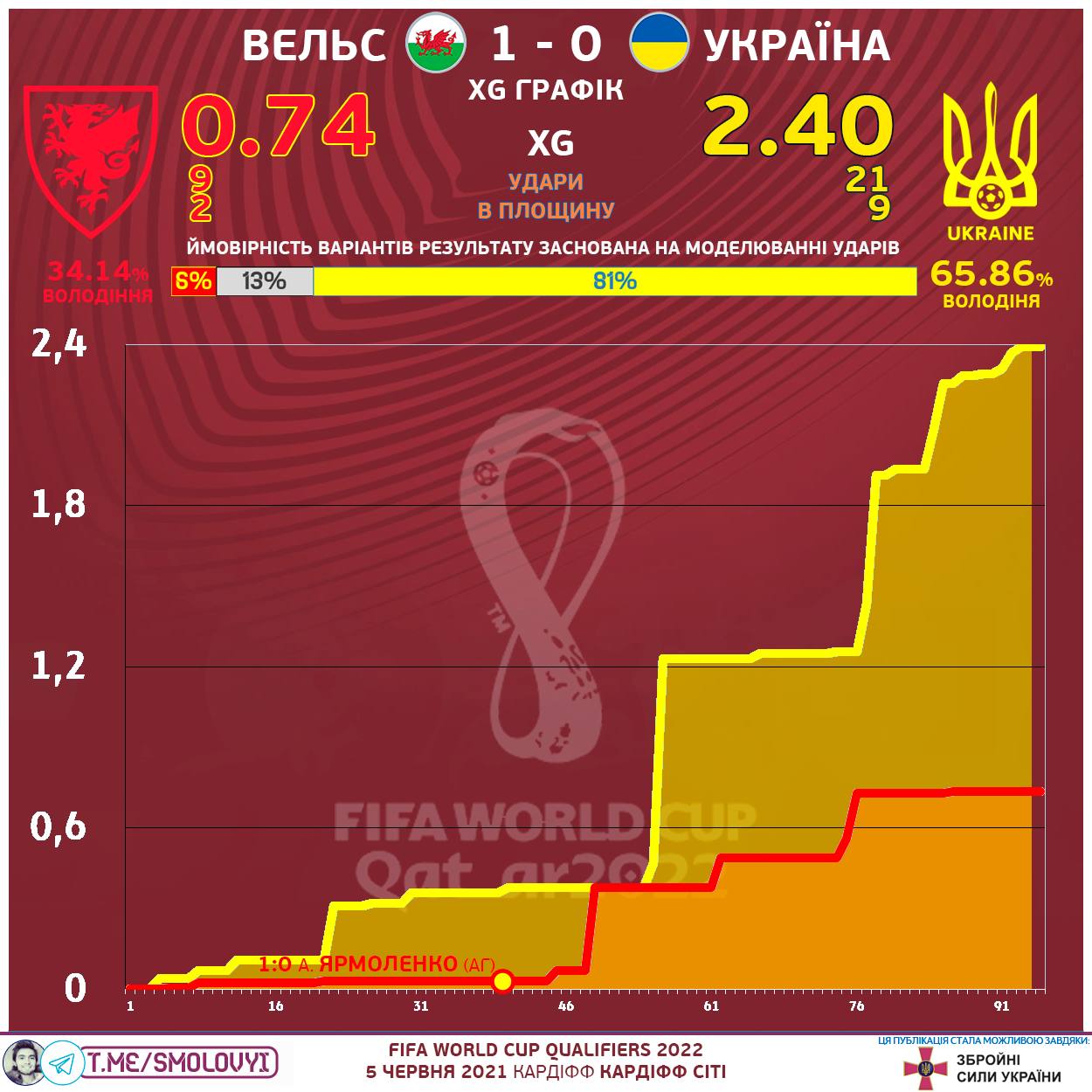 Блогер Михайло Смоловий у своєму телеграм-каналі поділився статистикою щодо вчорашнього матчу Вельс - Україна (1:0).