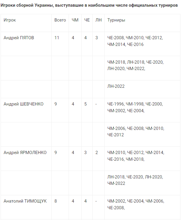 В общей сложности Пятов провел на высшем уровне 73 матча (ЧМ - 37, ЧЕ - 29, ЛН - 7) и уступает по этому показателю всего одну игру Андрею Шевченко.