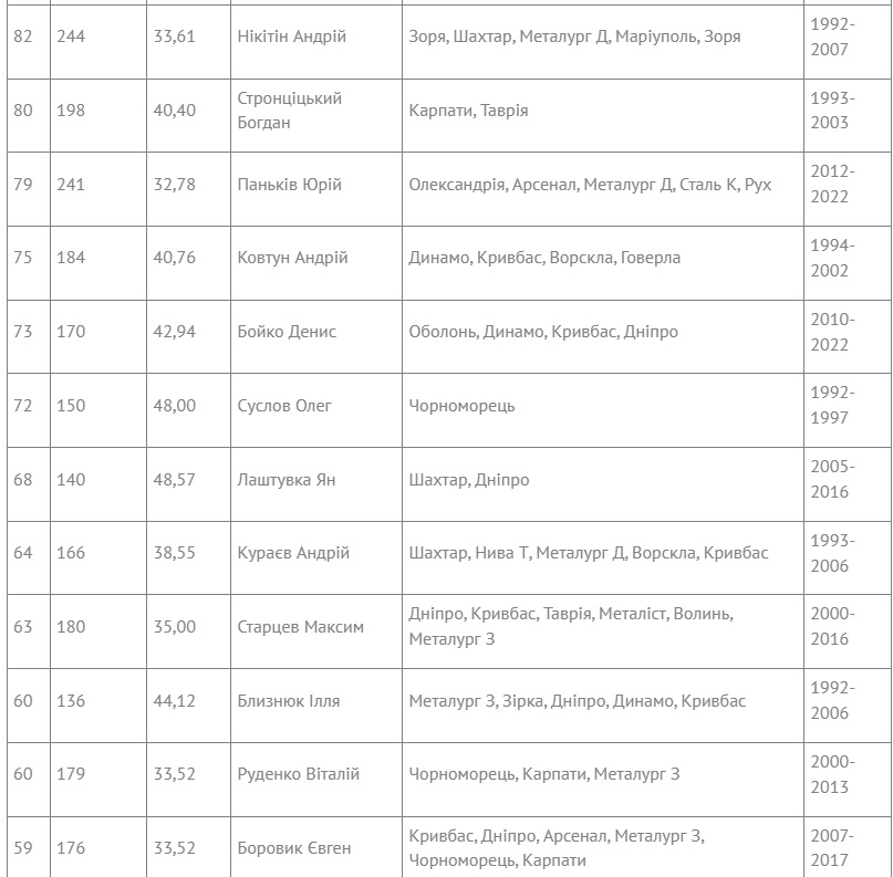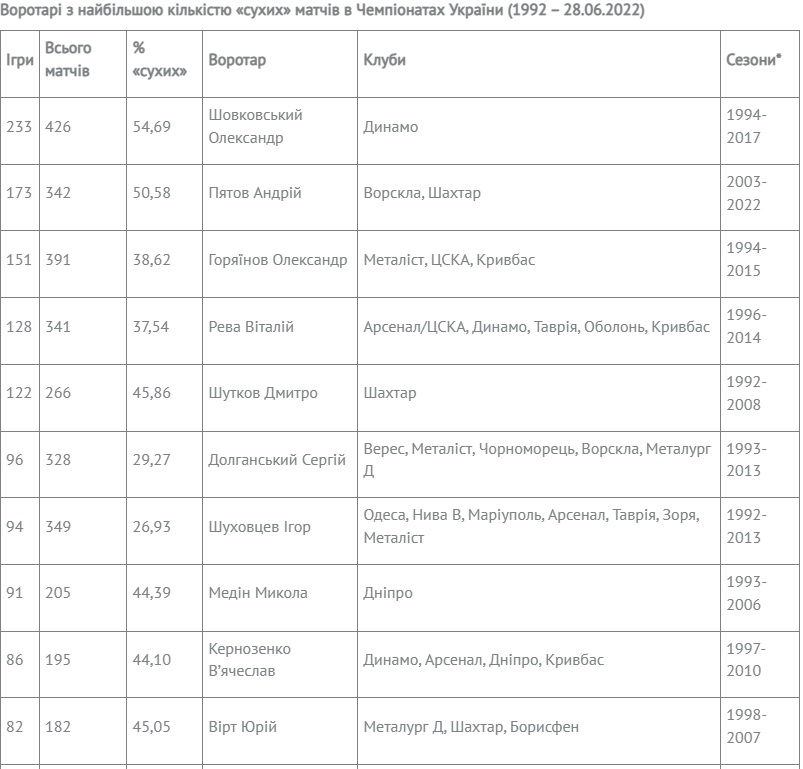 Среди которых 233 голкипера сумели провести хотя бы один матч без пропущенных голов. Уверенно возглавляет рейтинг самых «сухих» вратарей Александр Шовковский из «Динамо» – 233 «сухих» игры.