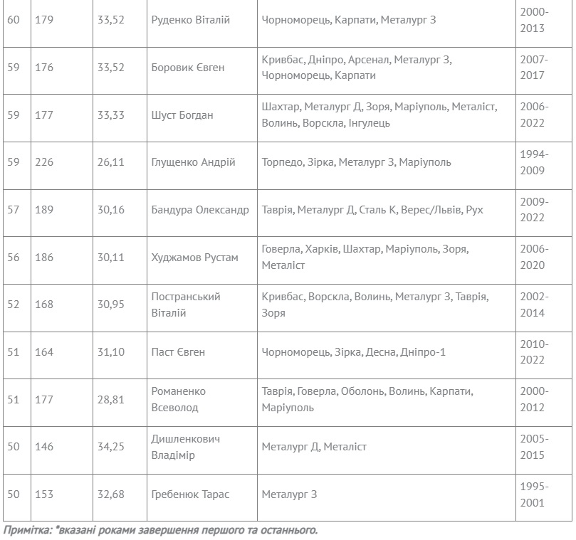 За всю историю чемпионатов Украины было задействовано 297 вратарей.