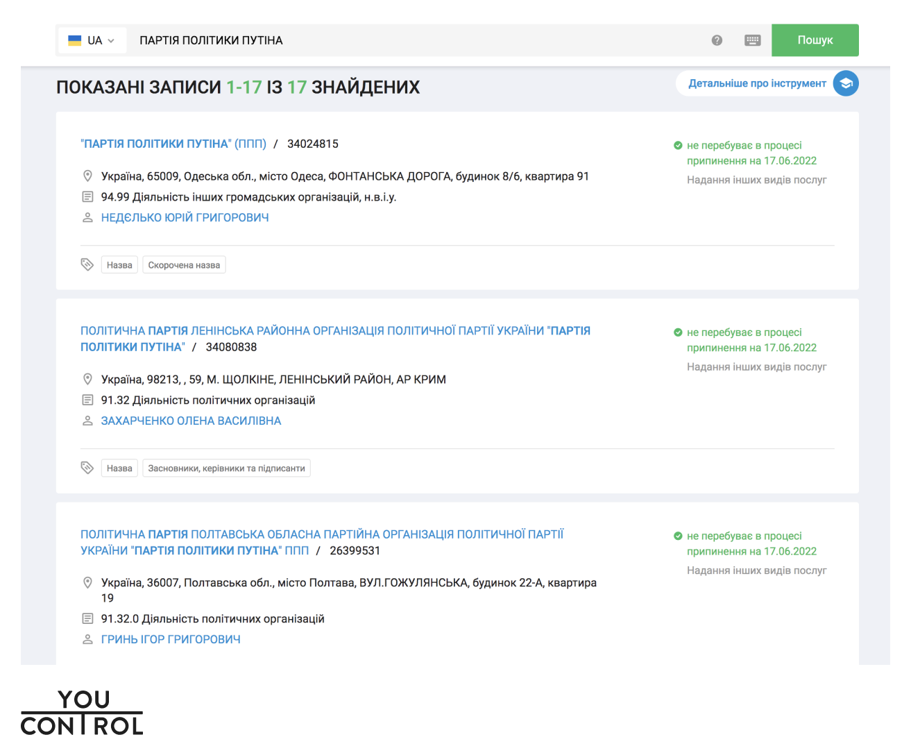 Пока Украина четвертый месяц отбивается от нашествия "русского мира" на ее территории продолжает действовать 17 центров "Партии политики ПУТИНА". Это могло бы походить на неудачную шутку, но данные из Единого государственного реестра в системе YouControl свидетельствуют об обратном.