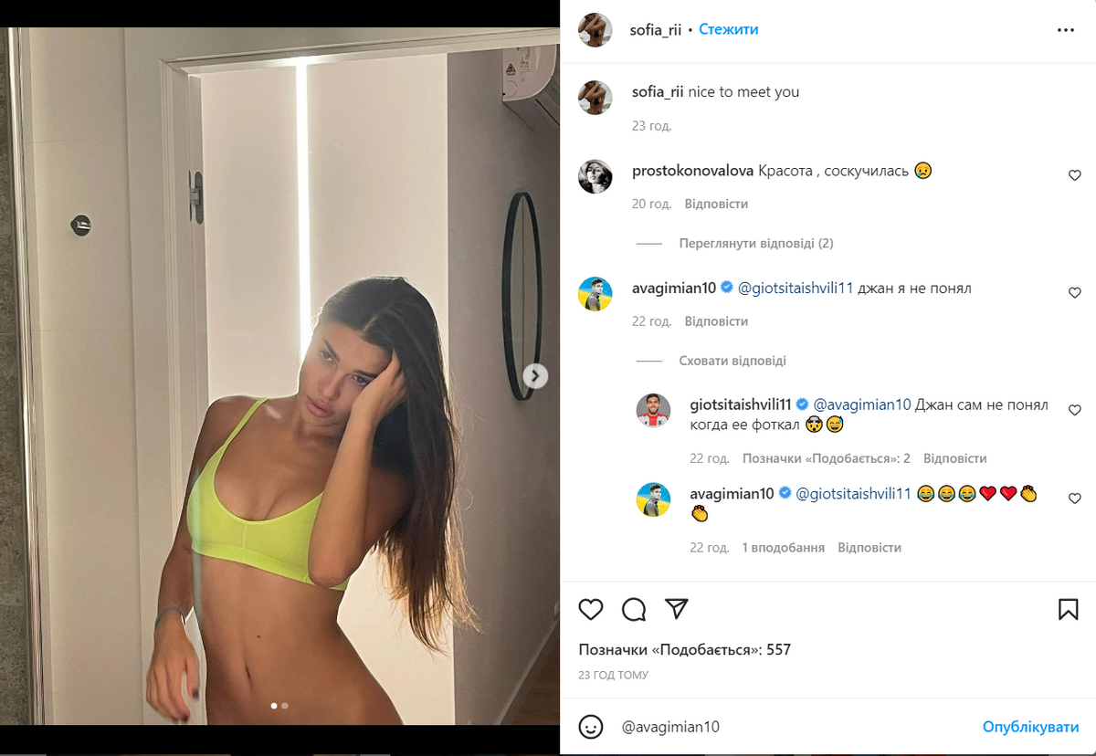 Потрясающий образ Софии не оставил равнодушным хавбека Александрии Артура Авагимяна. Шокированный футболист написал в комментариях: "Джан, я не понял". И получил оригинальный ответ от Гио: "Джан, я сам не понял, когда фотографировал ее".