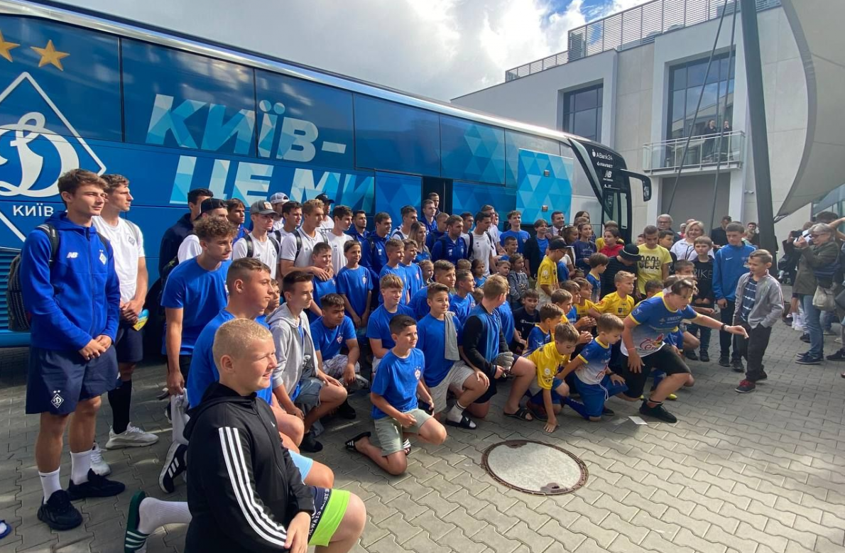 Уже у гостиницы команда почувствовала себя как дома, ведь "Динамо" встречали дети, украинские волонтеры и местные болельщики - всего около сотни человек. Вместе с поклонниками динамовцы спели Гимн Украины, а Сергею Сидорчуку, как капитану команды, вручили каравай с солью, которыми по украинской традиции встречают дорогих гостей.