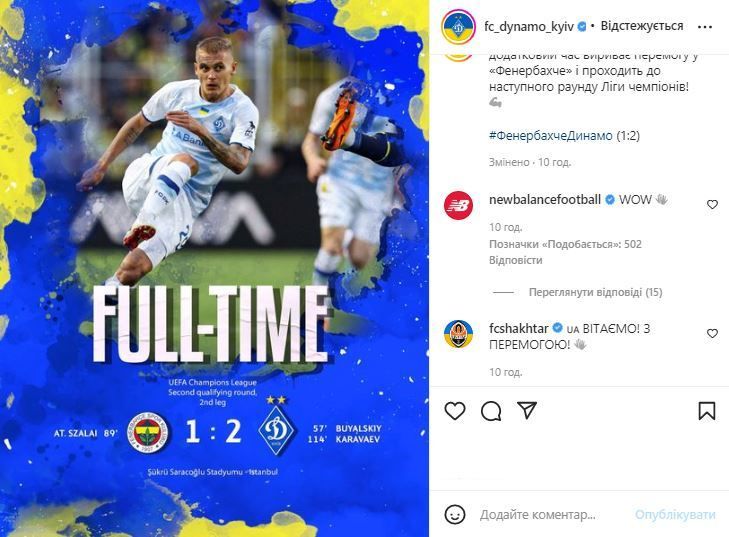 После завершения игры киевляне опубликовали пост в своем официальном аккаунте в Instagram с результатом встречи. Публикацию прокомментировал донецкий "Шахтер", который поздравил бело-синих с победой.