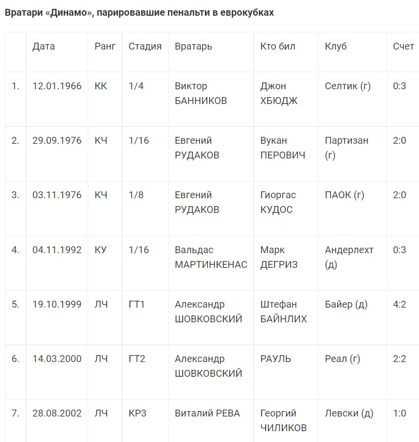 Всего на счету динамовских голкиперов теперь 9 пенальтийских сейвов: 7 - в Лиге (Кубке) чемпионов, по 1 - в Кубке кубков и Кубке УЕФА. Чаще других выручали команду Александр Шовковский - 3 раза и Евгений Рудаков - 2.