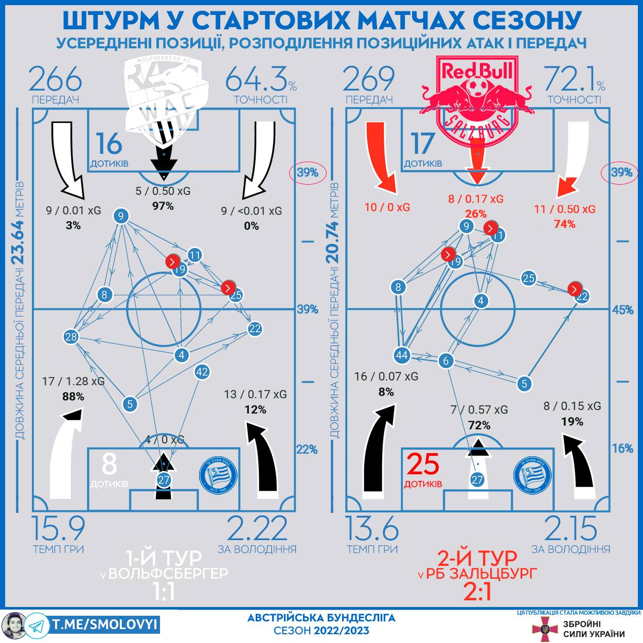 Штурм дуже мало возиться з м’ячем у першій третині (22% та 16% усіх передач), орієнтуючись на ДУЖЕ швидку доставку одразу до фінальної третини (по 39% усього обсягу передач). Для кращого розуміння картини, точність передач вперед їх ЦЗ та основного опорника: