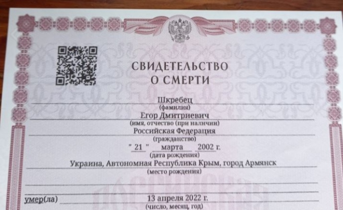 Отец российского солдата-срочника Егора Шкребца, проходившего службу на крейсере "Москва" и объявленного пропавшим без вести, получил свидетельство о смерти сына спустя 110 дней после его смерти.