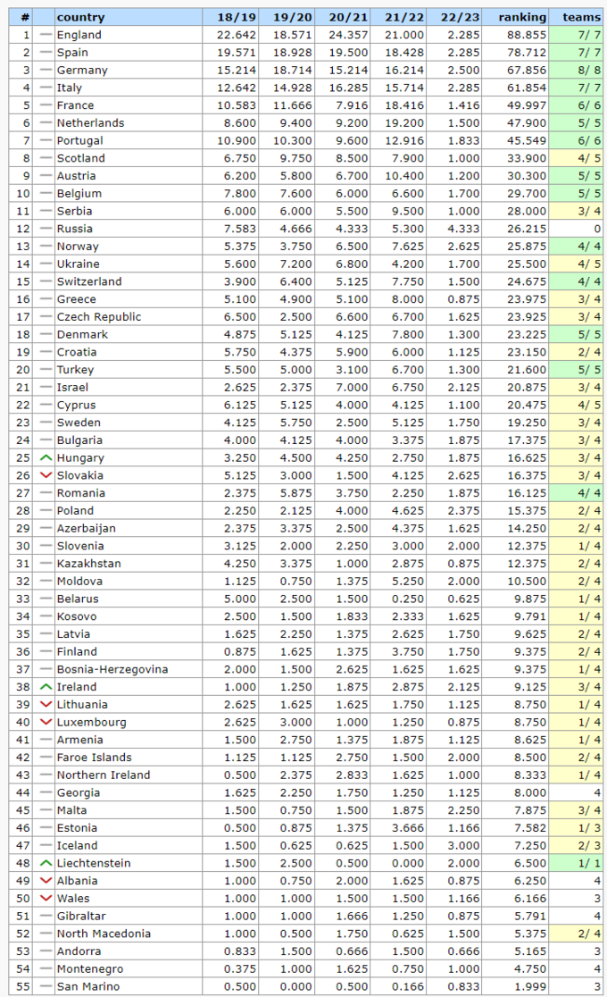 Таблица коэффициентов УЕФА 2023